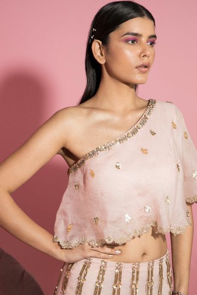 Nude pink Dori embroidered mermaid lehenga with sequins, stones, and pearl detailing. It is paired with a one-shoulder cape top in organza.