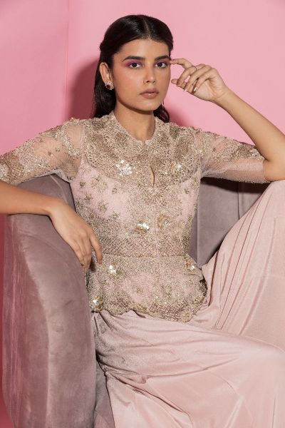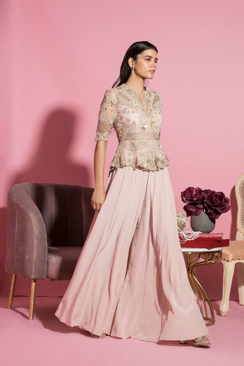 Nude Pink dori, metallic sequins embroidered net peplum jacket with kalidar palazzo in crepe. It has cut-work detailing at the hem and sleeves.