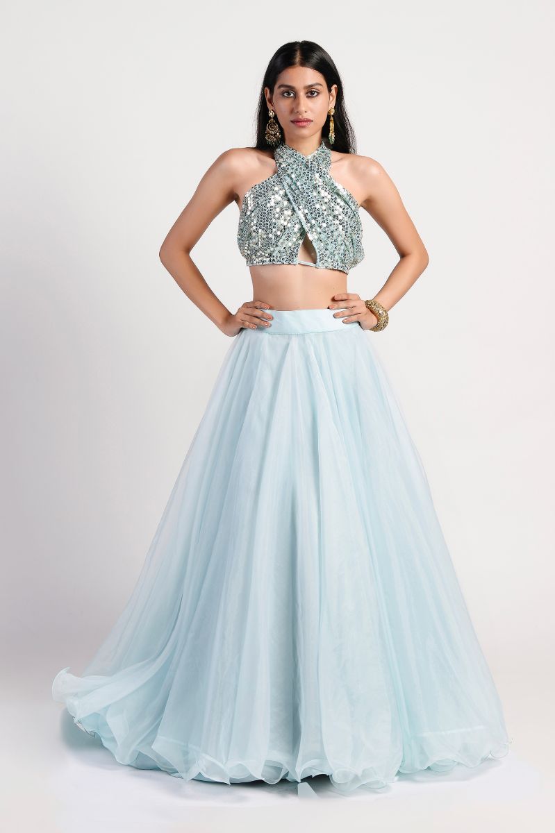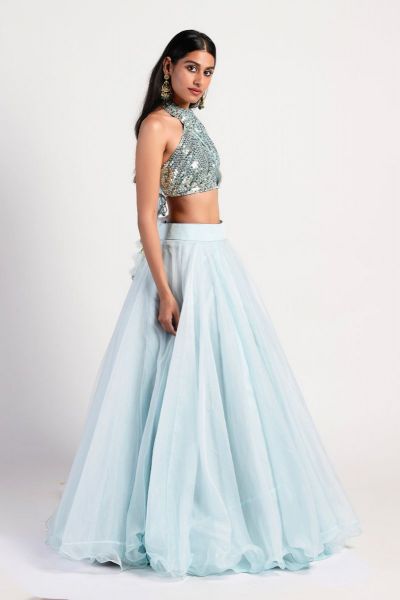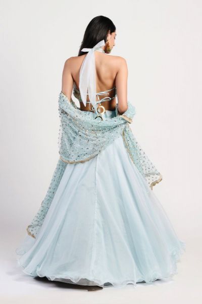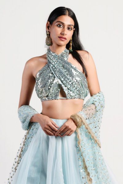 Ice blue lehenga paired with sequin embellished halter backless blouse enhanced with tassel tie-up back straps.