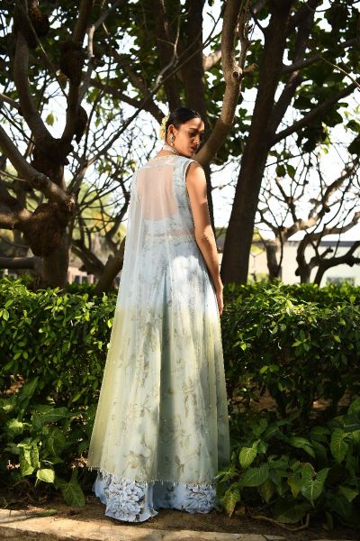 Pale Blue Floral Printed Georgette Lehnga with a pearl and zardozi hand embroided belt. A matching printed sleeveless blouse with cutout neckline and deep back. Comes with a sage green and pale blue shaded net sleeveless cape, hand embroided on the panels and finished with pearl drops.