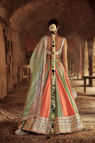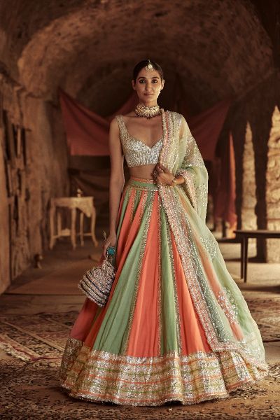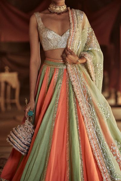 Itrh designs an ethereal lehenga colour blocked in peach and mint panel, featuring embellished border detailing, teamed with a textured blouse and gota patti and kiran border trimmed dupatta. Complement the look with polki jewellery pieces.