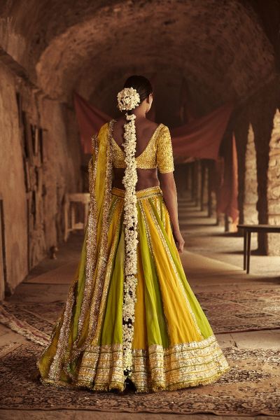 Itrh designs an ethereal lehenga colour blocked in peach and mint panel, featuring embellished border detailing, teamed with a blingy striped blouse and kiran border trimmed dupatta. Finish off the look with a statement maang tikka and chandbaalis.