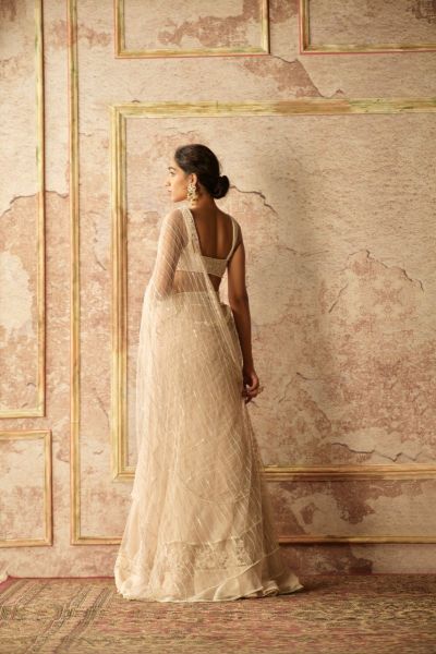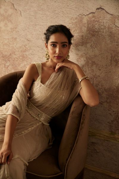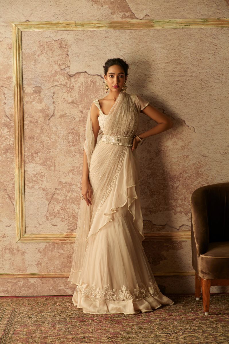 A saree with a draped ruffle and a dirty ivory net embroidered blouse is paired with a pearl embroidered belt.