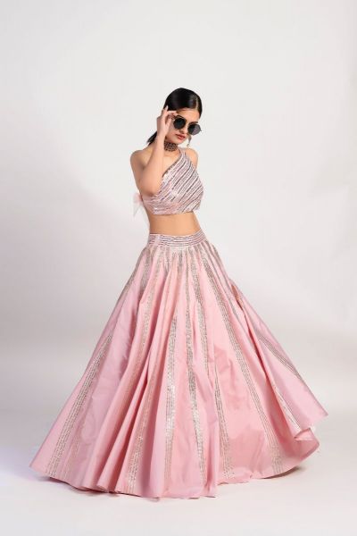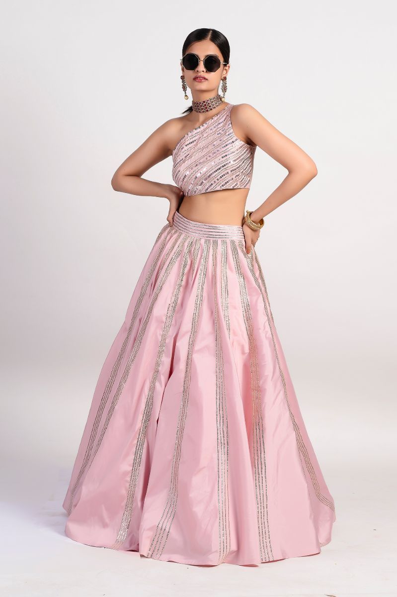Pastel pink lehenga with all-over silver sequin work in striped pattern. Comes with one-shoulder cropped blouse