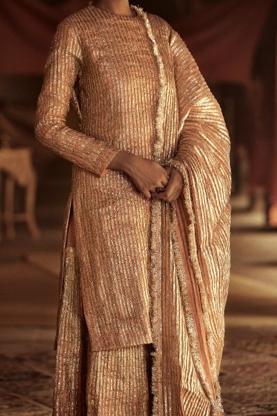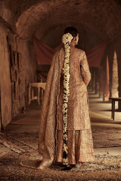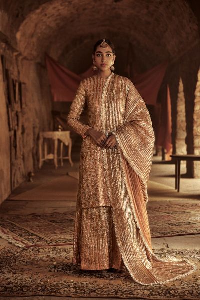 This beguiling chanderi kurta sharara set with handcrafted lampi stripes, teamed with a silk organza dupatta featuring lampi stripes edged with fine kiran. Style the look with polki chandbaalis.