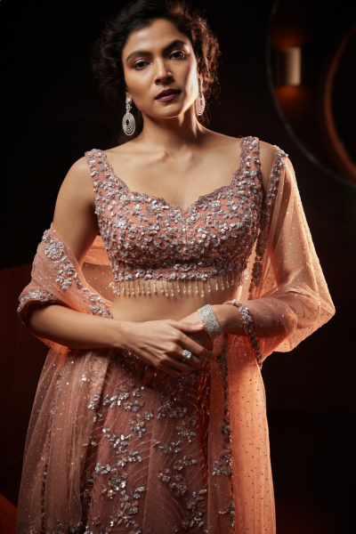 This metallic lehenga collection is combined with a soft tulle dupatta and features all-over sequin embroidery.