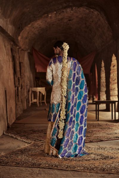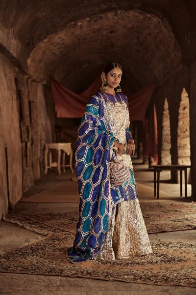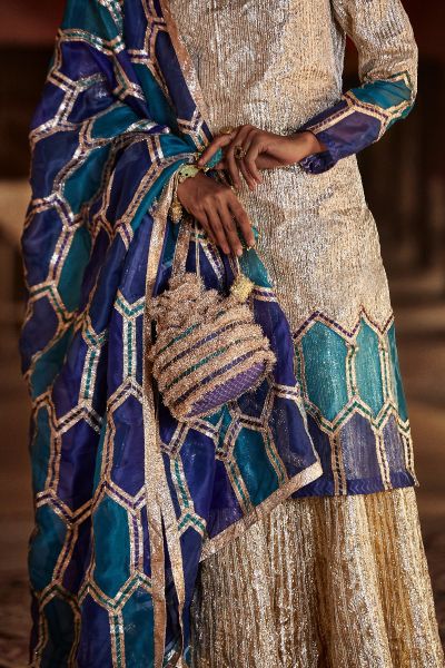 Festive-ready kurta and dupatta featuring stained glass mesh pattern highlighted with lampi and khadi, teamed with a silver textured sharara. Style the look with Swarovski chandbaalis.