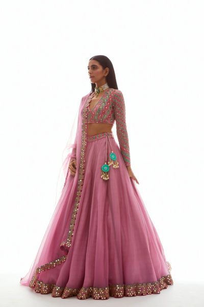 Exquisite lehenga with a blouse primped with intricate hand embroidery and mirror work on the dupatta. Accessorize the look with a kundan necklace set.
