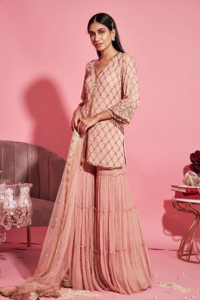 Pink cut-daana hand embroidered kurta in georgette with bell sleeves and tassel detailing kurta paired with a tiered sharara in chiffon. It is paired with a net dupatta with scalloped lace.