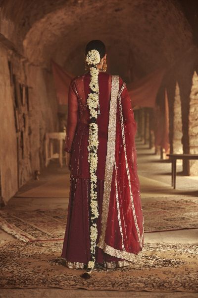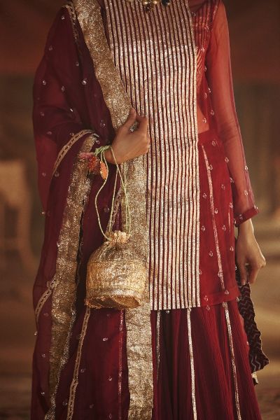 An organza kurta and bralette inner featuring lampi stripes and crystals, teamed with a crushed cotton sharara and dupatta. Complement the look with a statement maang tikka and chandbaalis.