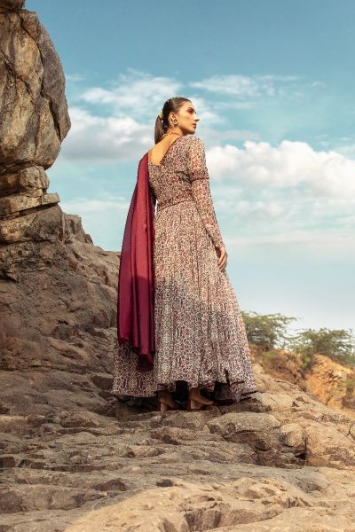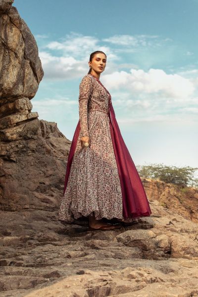 Printed anarkali with a pre-draped organza dupatta and antique embroidered belt to accentuate the waistline. Style the look with a polki jewellery set.