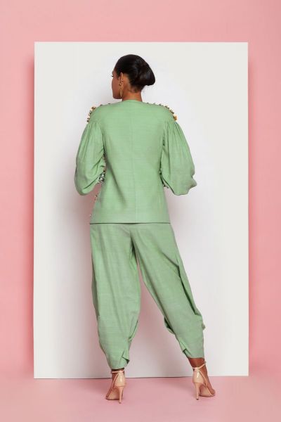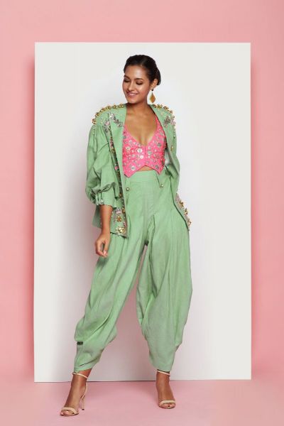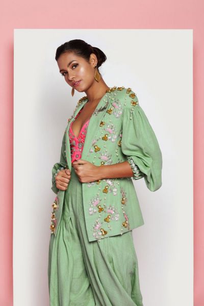 The original Papa Dont Preach Pantsuit, embellished jacket with shoulder detail, paired with neon denim waistcoat with metallic embellishment, and tailored dhoti pants.