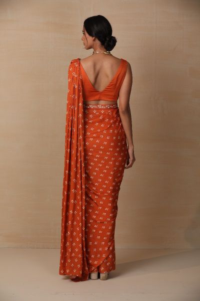 RUST PRINTED SATIN SAREE SET