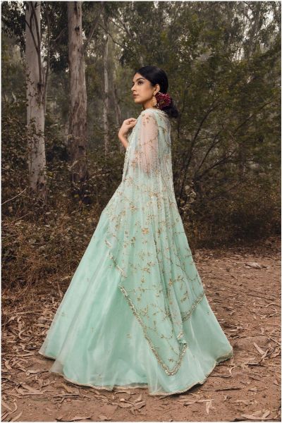 Set of zardozi hand embroidery and mirrorwork on sea green organza lehenga.