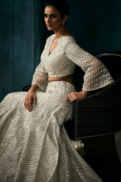 This silver lehenga set features intricate metallic all over embroidery and is paired with a net embroidered dupatta.