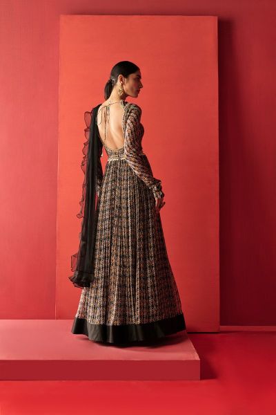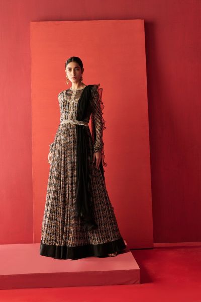 Black Multi Ikat printed and embroidered chiffon Anarkali paired with a net dupatta and an embroidered belt.