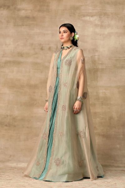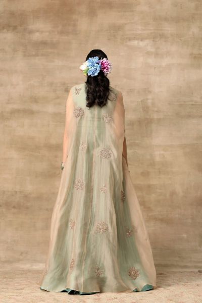 Ridhi Mehra creates a modern anarkali with a sheer organza embroidered cape on top. Add a pair of chandbali earrings to complete the look.