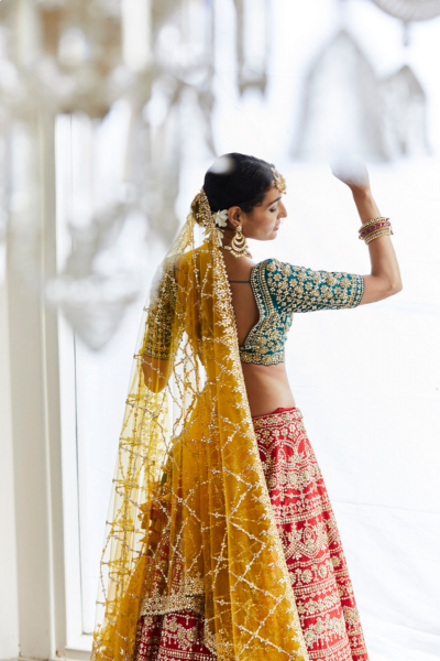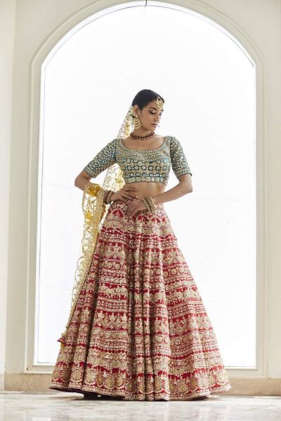 This three-color lehenga set is combined with a yellow net dupatta and features traditional gota patti embroidery.