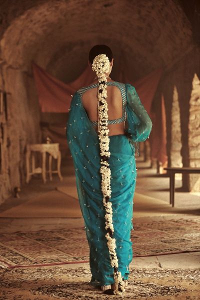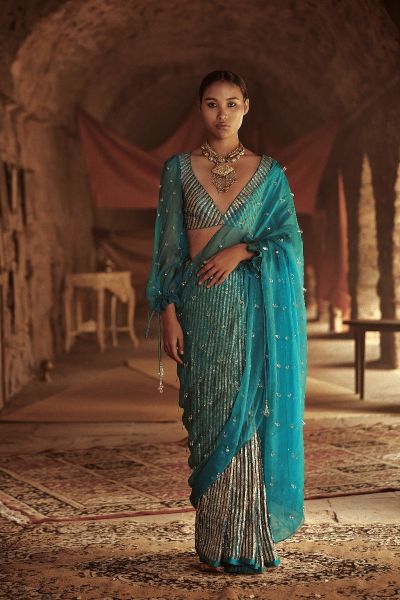 Silk organza sari adorning crystal droplets and lampi stripes, teamed with a statement blouse featuring balloon sleeves. Style the look with a statement necklace.