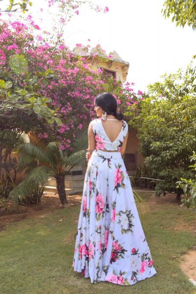 Crepe white printed crop top with a plunge hand embroided neckline. Comes with flared sharara pants and a cape with hand embroided cuffs and frill finishing.