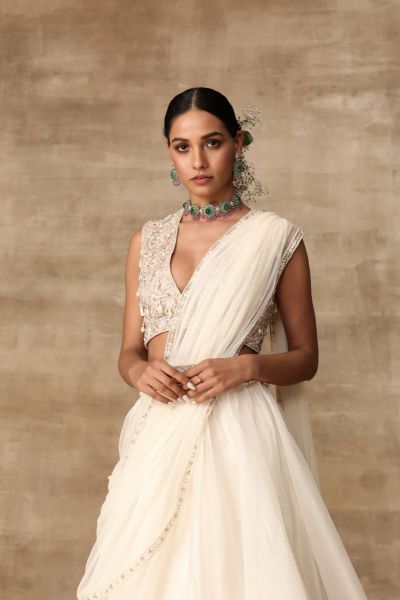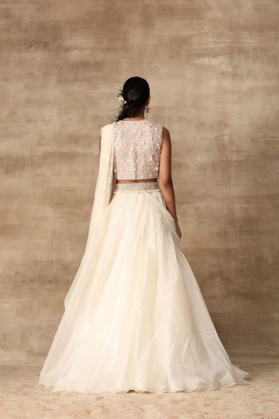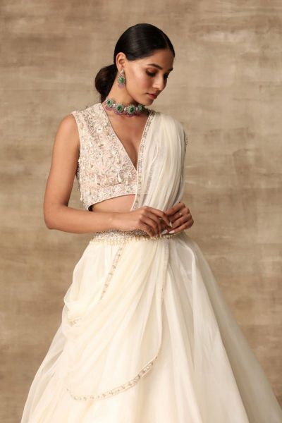 Ridhi Mehra creates a romantic look with a heavy pearl embroidered organza blouse and an ivory flared organza skirt with an embroidered net dupatta and pearl belt. Wear an emerald or ruby necklace set to complete the look.