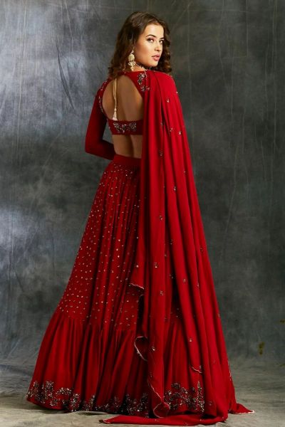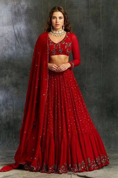 Red georgette lehenga with gold booti and heavy border. It comes with handwork on the georgette choli and dupatta.