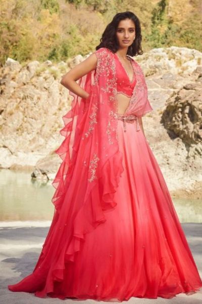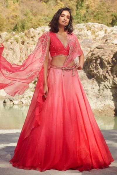Zardozi embroidery on ombre fuchsia silk organza lehenga set.