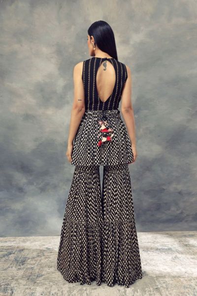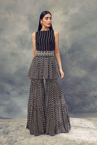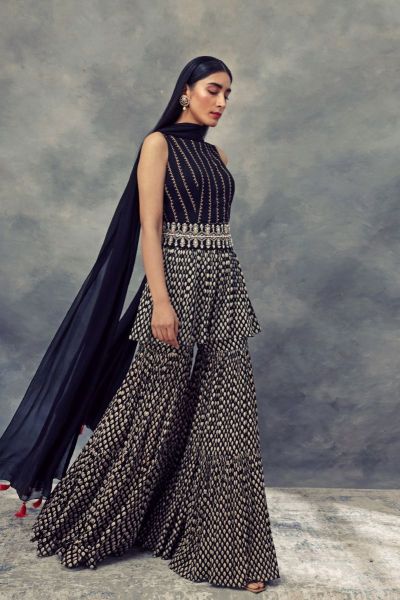 A modern festive look with this printed peplum kurta and sharara, featuring pearl embroidery on the belt, teamed with a black dupatta. Style the look with silver jhumkis.