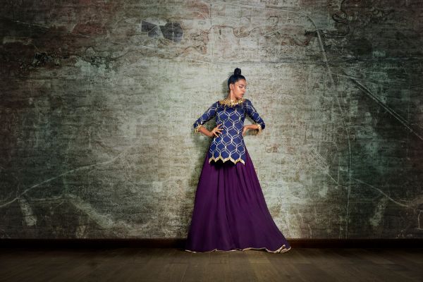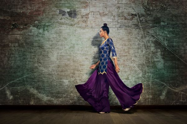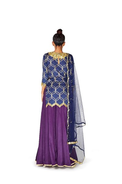 Featuring a blue short kurta in modal satin base with foil printing and scallop edging, embellished using sequins and cutdana with salli tassel detailing. It is paired with a matching net embroidered dupatta and contrast purple palazzo pants.