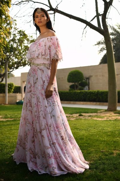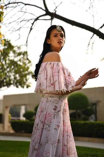 Blush Pink Floral Printed Georgette Lehnga with hand embroided belt. Comes with a pleated blush pink printed off-shoulder crop top finished with pearl tassels.