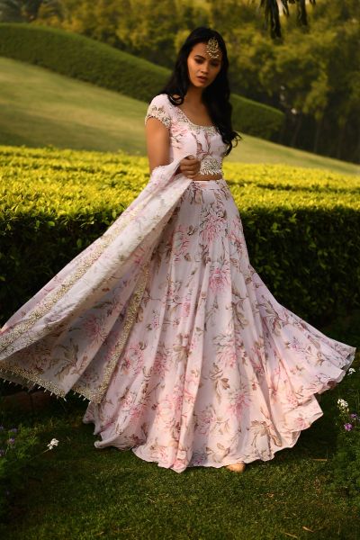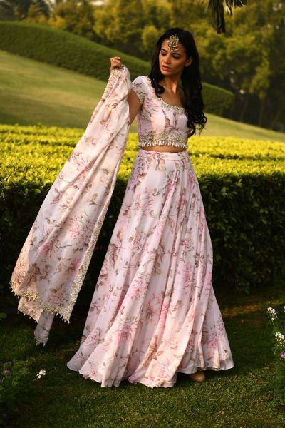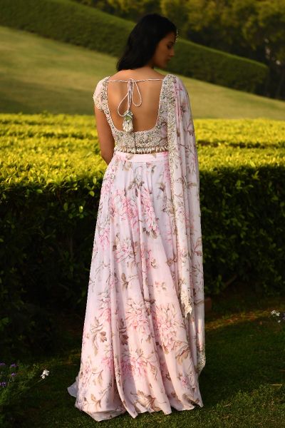 Blush Pink Floral Printed Georgette Lehnga with a matching printed hand embroided blouse finished with pearl tassels. Comes with a chiffon printed dupatta hand embroided on all sides finished with sage green raw silk finishing and pearl tassels.