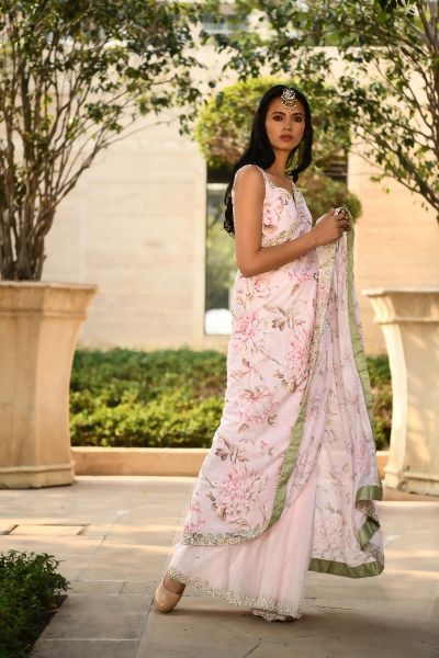 Blush Pink half net and half chiffon printed sari with hand embroided borders finished with sage green raw silk. Comes with a blush pink printed hand embroided blouse finished with pearl mirror tie back tassels.