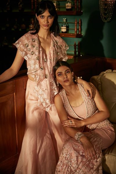 ayer Sharara in Embroidered Net Highlighted With Cheeta Work Paired With Bustier and Embroidered Checks Jacket.