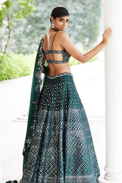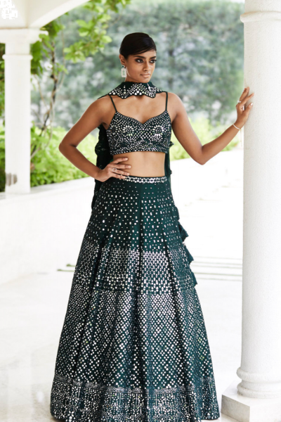 BOTTLE GREEN MIRROR WORK LEHENGA SET