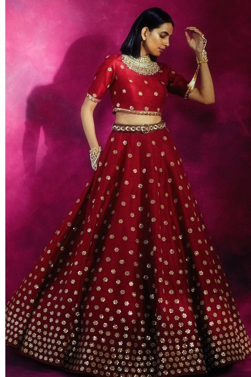 This ethereal red skirt by Vvani by Vani Vats is paired with a high neck crop top and features rich floral embroidered motifs in sequins and cut dana. An embellished clutch completes the look.