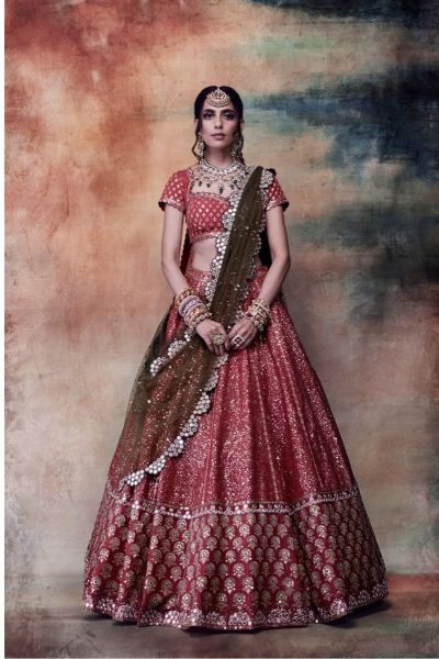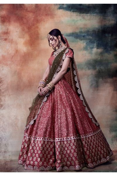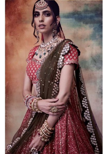 Intricately hand embroidered with zari, moti , nalki, sequin & mirrors Sweetheart neck blouse with a broad mughal boota border skirt and mirror and sequin border two dupattas.