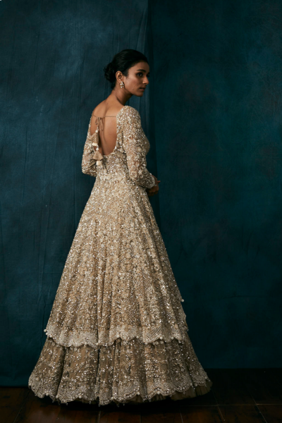 With delicate thread and sequins embroidery this dazling gold lehenga set features a skirt which is paired with a high-low embroidered jacket and a net dupatta.