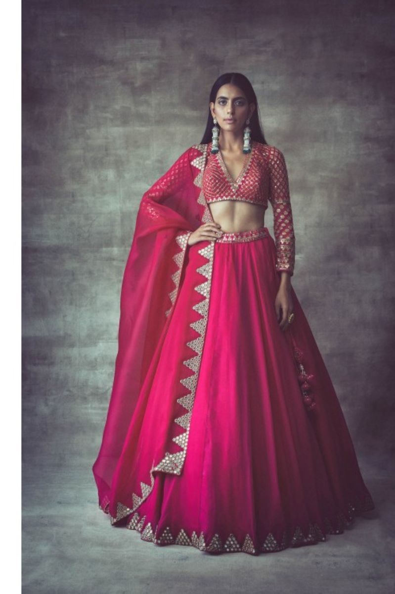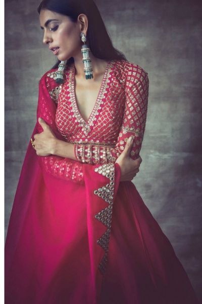 Intricately hand embroidered with sequin, zari and dhaga v- neck blouse with a silk organza skirt and dupatta with mirror borders