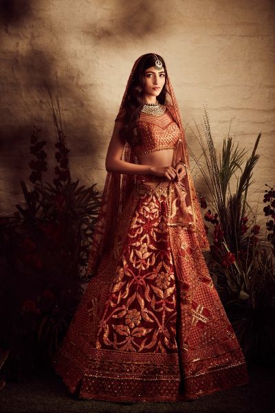 Mulitple kalis story lehenga in brocade and organza with abstract and unique embroideries on each lehenga.
