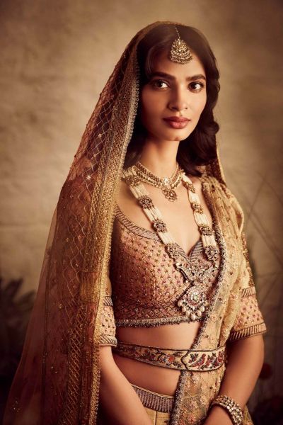 Enormous guldasta and bird big motifs on lehenga embroidered on raw silk with net dupatta and embellished belt.