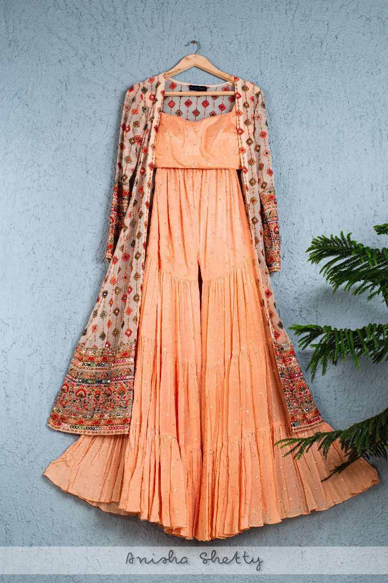 CORAL PEACH SHARARA SET WITH SUMMER THREAD WORK JACKET