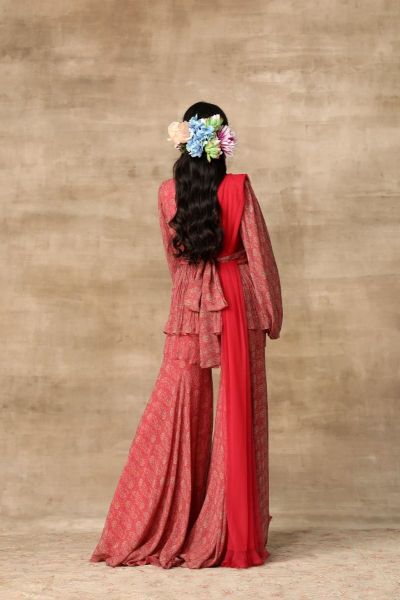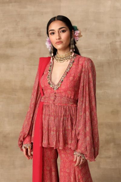 Ridhi Mehra creates a contemporary sharara ensemble with a peplum kurti and primped paisley print accents. Add a pair of statement earrings to complete the look.