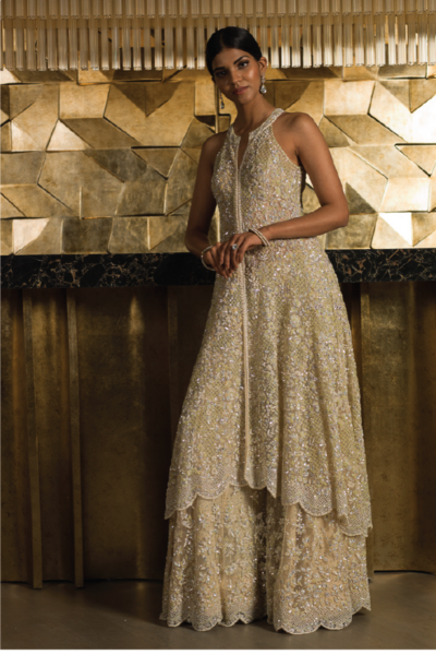 With alluring resham embroidery this garara set exhibits intricate and pearl and sequins work. The garara is complimented with a sleeveless high-low top.