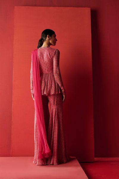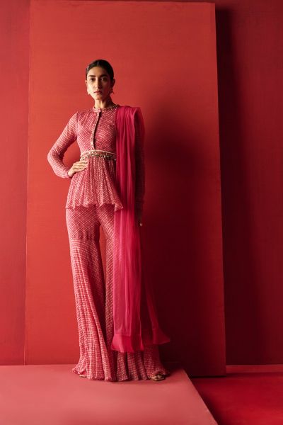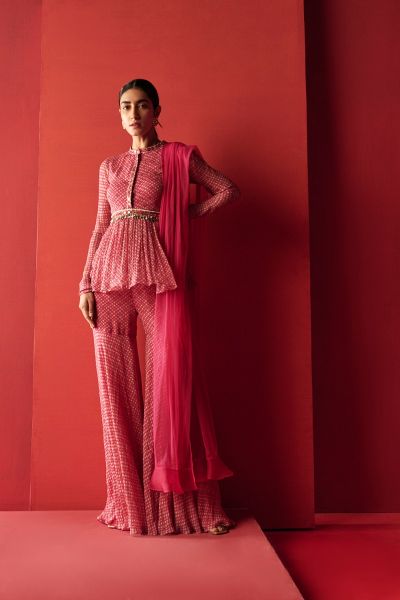 Fuchsia folk printed chiffon embroidered peplum paired with a printed sharara and a net dupatta.