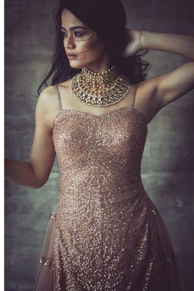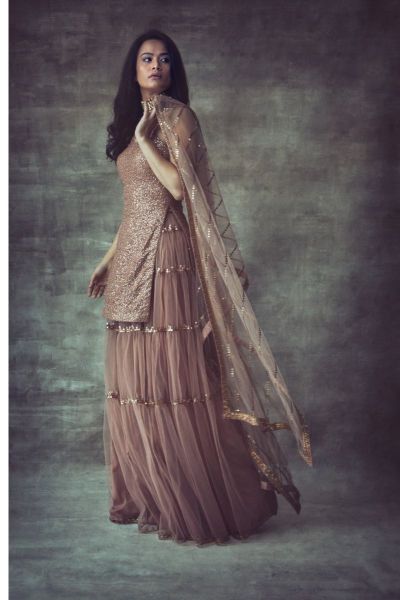 Sequined spaghetti kurta with tier sharara and hand embroidered border dupatta.