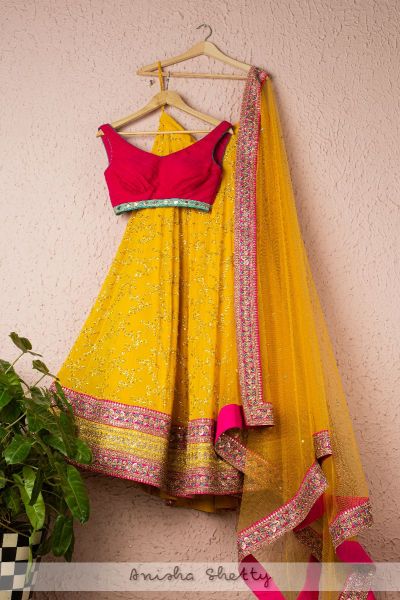 MARIGOLD YELLOW LEHENGA WITH HOT PINK PLEATED BLOUSE AND MARIGOLD YELLOW DUPATTA