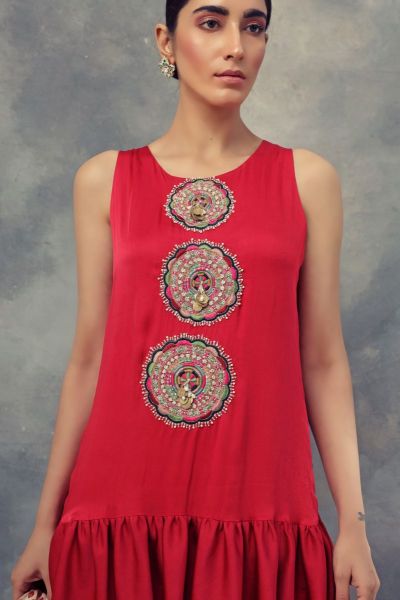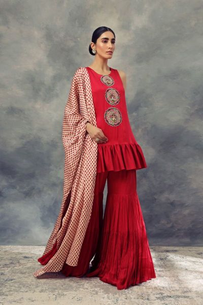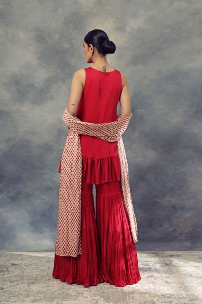 RUBY RED FRILLED KURTA AND SHARARA SET