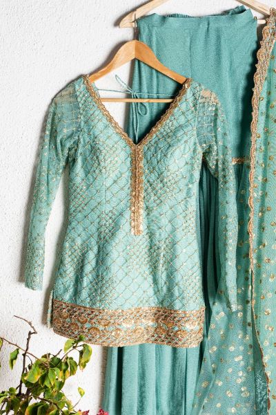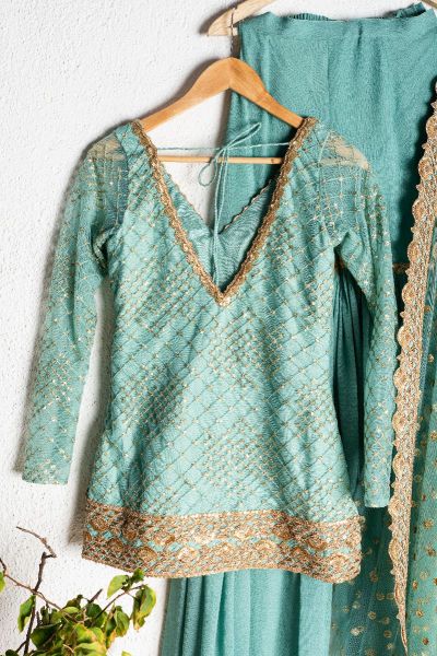This Sharara is made of Georgette.Kurta has Net and Kurta Border has Cutwork Sequence Lace.Dupatta is Net , with Sequence work and Cutwork Sequence lace.