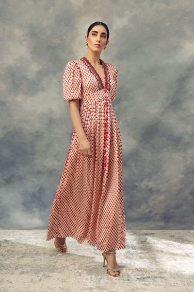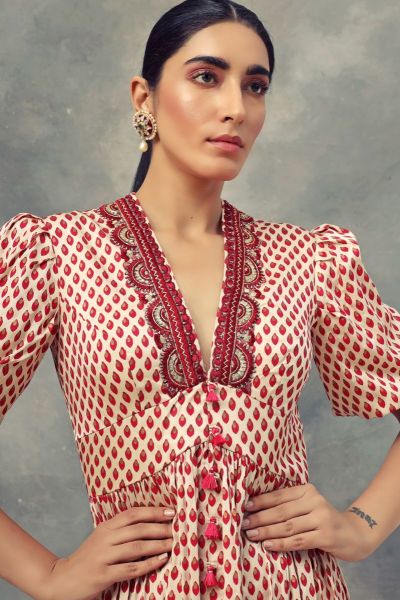 Featuring this bindu print dress with draped puff sleeves & thread embroidered neckline. The dress is embellished with handcrafted resham tassels.