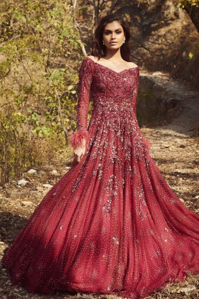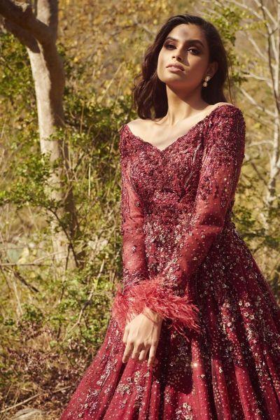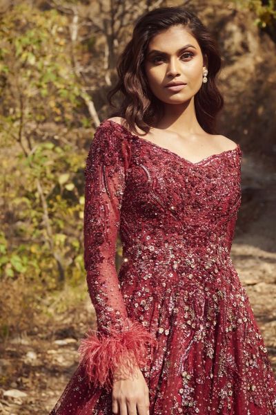 Zardozi embroidery on burgundy glitter tulle gown with Japanese cutdana, french sequins, and feathers.